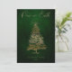 Design de feriado elegante, impressionante e eterno com pinheiro em estilo gravado com gradiente dourado com o roteiro personalizado de caligrafia em ouro "Paz na Terra" sobre o brilho de fundo de artisan verde profundo com duas linhas de texto editável e gráficos complementares atrás. Todos os elementos gráficos são editáveis.