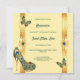 A beautiful, vibrant and luxurious design featuring a pale yellow background on which vertical faux gold bands appear with decorative golden swirls and peacock feathers. Small butterflies are flitting around and a stunning golden stilleto shoe adorned with peacock feathers appears in the bottom left corner. This graphic may be deleted if not required. Forest green text templates appear down the middle of the 5x7 invitation and are fully customizable. The back has the same design, and additional templates for extra information you may want your guests and family to know. If not required, delete the wording to leave the back with the design only. This stylish, glam, elegant and traditional design is ideal for any 15th birthday Quinceañera or special milestone celebration.
