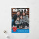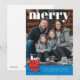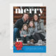 This customizable photo card is a perfect way to send festive cheer. It features a large full-bleed photo template and the bold word "merry" across the top. The card's bottom section has a vibrant blue banner where a classic Peanuts graphic shows Snoopy resting on his doghouse, which is decorated with Christmas lights. The banner includes customizable fields for the Family Name, individual signatures, and the Year. This design combines a recognizable Snoopy Christmas scene with a modern photo layout, making it a delightful holiday announcement.