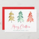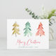 Um cartão de férias moderno mínimo com aquarelas abstrato de pinheiros em ouro, vermelho e verde, "Feliz Natal" escrito em um bonito roteiro vermelho e seu nome de família e ano em um texto simples de coordenação verde.