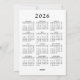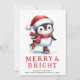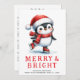 Este cartão de Natal personalizado moderno apresenta um pinguim fofo de patinação no gelo com um chapéu de Papai Noel vermelho, cachecol e patins de figura em um fundo branco. Uma frase "Alegre e Brilhante" e texto de modelo para saudações, nome da família e um ano estão na frente do cartão; o verso apresenta um calendário de domingo a sábado de 2026.