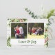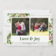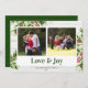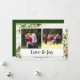 Este cartão de Natal com tema rústico oferece 2 fotos quadradas e a mensagem "Amor & Alegria". O fundo é uma base de madeira branca acentuada com galhos de pinheiro verde exuberante e bagas. Fotografia © Storytree Studios, Stanford, CA