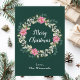Este cartão de natal de cor-de-água festiva e divertida pode ser personalizado com um nome ou título. Apresenta uma coroa aquática de Natal com poinsetos cor-de-rosa e holly sobre um fundo verde escuro. O texto combina a escrita manual e as fontes serif modernas para um aspecto elegante e sofisticado.