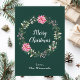 Este cartão de natal de cor-de-água festiva e divertida pode ser personalizado com um nome ou título. Apresenta uma coroa aquática de Natal com poinsetos cor-de-rosa e holly sobre um fundo verde escuro. O texto combina a escrita manual e as fontes serif modernas para um aspecto elegante e sofisticado.