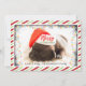 Cartão de Natal com uma fotografia adorável de um filhote de cachorro dormindo enquanto veste um chapéu de Papai Noel. Feliz Natal está escrito na banda de seu chapéu, com uma letra manuscrita na moda. Uma borda cinza com luzes coloridas de Natal cercando a moldura dessa foto fofinha. O fundo é um padrão festivo listrado de cana doce em branco vermelho e verde. Personalize com seu nome. A linha de assinatura diz: Amor e Pugs, com seu nome.