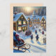 Um cartão de feriado representando uma charmosa vila de neve, onde as crianças caminham alegremente com trenós, abraçando o espírito de aventura e maravilha.