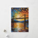 Um pôr do sol vibrante lança um brilho quente sobre um rio sereno, atravessado por uma ponte silenciada com árvores em ambas as margens. O céu está pontilhado com manchas coloridas, semelhantes a mosaicos, criando um pano de fundo vivo e dinâmico.