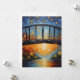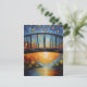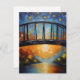 Um pôr do sol vibrante lança um brilho quente sobre um rio sereno, atravessado por uma ponte silenciada com árvores em ambas as margens. O céu está pontilhado com manchas coloridas, semelhantes a mosaicos, criando um pano de fundo vivo e dinâmico.