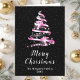 Este cartão de férias elegante e sofisticado pode ser personalizado com o nome da sua família. O design apresenta uma árvore de Natal com fita rosa e preta e presentes. O texto combina caligrafia manuscrita e fontes modernas sem serifa para um visual clássico e sofisticado. A neve caindo, flocos de neve e brilhos dão um toque festivo e mágico.