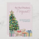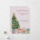 Nosso primeiro Natal grávida! Diga feliz natal e avise a todos que está esperando e seu bebê está vencido. Cartão bonito com lavanda neutra do gênero e paleta de cores verdes, ilustrado com árvore de natal, berço de bebê e presentes embrulhados por presente. Por favor, navegue na minha coleção de Anúncios de Gravidez Natal para mais designs.