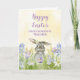 Cartão de saudação de professor de felz pascoa com uma ilustração fofinha de um coelho de Páscoa num campo de primavera com flores de aquarela.