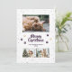 Cute purple photo Meowy Christmas card featuring three photos, snow and paw prints on the front and a snowy background at the back. Easily personalize this cute photo Christmas card with your photos, family name and the year.