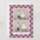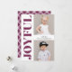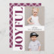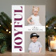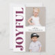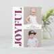 Na moda, cartão com fotos de feriado moderno, com "Joyful" em uma fonte roxa, em moda, arrojada, ao longo do lado esquerdo da placa. Personalize a frente do cartão, adicionando duas das suas fotos favoritas e o seu nome. O cartão de feriado bonito se reverte a apresentar duas fotos adicionais, o ano, e um padrão de xadrez branca-chic com fundo roxo. Projetado para coordenar com nossa coleção de feriados alegre moderna.