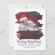 Cartão de férias elegante que diz "Feliz Natal" e "paz amor alegria". Em cores festivas vermelhas e azuis.