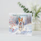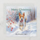 Um cartão de Natal atraente com uma foto de um cachorro Fox Terrier correndo pela neve em um dia ensolarado, em um estilo aquoso. Ideal para amantes de cães, o cartão de feriado de na moda pode ser personalizado com seu(s) nome(s) ou outro texto.