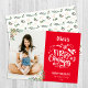 O moderno Red Elegant Script Baby First Christmas Holiday Card. Envie desejos e saudações quentes de férias aos seus entes queridos com este elegante, chic e moderno Cartão com fotos Holiday com "Baby's (Baby name) First Christmas" em caligrafia com letras na moda com cores e folhagem douradas. Desejo a todos um Feliz Feriado e um Incrível Ano Novo!