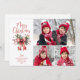 Enviar saudações MERRY CHRISTMAS nesta temporada de festas com um cartão de saudação de fotos com 3 fotos e tipografia moderna, vermelha de chic, para a saudação destacada com um arco vermelho de aquarela e holly. ASSISTÊNCIA: para obter ajuda com a modificação ou personalização do design, redimensionamento, transferência do design para outro produto ou, se você quiser coordenar itens, entre em contato com o designer ANTES DE ENCOMENDAR através da guia MENSAGEM de bate-papo Zazzle ou envie um e-mail para makeitaboutyoustore@gmail.com.