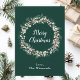 Este cartão de natal de cor-de-água festiva e divertida pode ser personalizado com um nome ou título. Apresenta uma coroa aquosa de Natal com sombra vermelha e bagas em fundo verde escuro. O texto combina a escrita manual e as fontes serif modernas para um aspecto elegante e sofisticado.