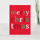 Este cartão de Natal contém as palavras Feliz Natal na frente, em cores clássicas de Natal vermelho, branco e verde.