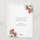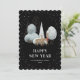 Cute black New Year card featuring a watercolor painting of a doe and a buck wearing a scarf in a snowy forest against a black background adorned with falling snow on the front and a watercolor painting of white poinsettia, conifer tree branches, holly and red berries at the back.