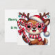 Este cartão de férias plano encantador apresenta uma rena adornada com enfeites e segurando uma cana de açúcar. Um design mágico para enviar votos calorosos a amigos e familiares nesta época de festas. Adicione sua mensagem para um toque pessoal.
