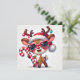 Este cartão de Natal plano apresenta uma rena alegre segurando uma bengala de doces, adornada com enfeites festivos. Perfeito para compartilhar o espírito da época com familiares e amigos. Personalize-o para torná-lo ainda mais especial.