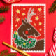 Saia da pilha de cartões de férias com este cartão de Natal ilustrado alegremente com uma rena feliz vestindo uma coroa coberta pelo pescoço contra um céu vermelho estrelado e tem um belo talento retrô e fácil de personalizar texto e uma foto no verso.