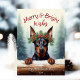 Este adorável cartão de cartões de natal apresenta uma ilustração fofa do Cachorro Doberman Pinscher vestindo uma coroa festiva de flores de inverno, Holly, pine e bagas, com flocos de neve suavemente caídos contra uma cena de inverno da Floresta Neves. O Doberman Pinscher está a espreitar o registro de neve para dizer olá! O texto lúgubre "Felizes e desejos brilhantes" adiciona uma saudação sazonal quente e pode ser personalizada como quiser. O verso é decorado com uma verificação de xadrez clássica, adicionando um toque tradicional ao design geral. Este cartão bonito e brincalhão é perfeito para enviar alegria de férias para a família e amigos, e o nome e data personalizáveis fazem dele uma marca personalizada.