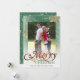 Este cartão de Natal apresenta sua foto e texto com uma saudação de Natal feliz e elegante em um roteiro de caligrafia elegante. Ele é acentuado com flocos de neve ouro sobre fundo verde-nevado. Este design está disponível em várias opções de cores.