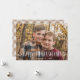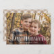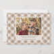 Cartão com fotos de Ação de Graças Russo com "Feliz Ação de Graças" exibido em texto branco escrito à mão adornado com trigo. Personalize a frente do cartão de Ação de Graças adicionando uma foto, seus nomes e o ano. A placa reverte para exibir uma segunda foto e mensagem opcional com um padrão de xadrez de aquarela em tons de marrom e bege.