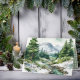 Beautiful watercolor highlands snowy mountain scene with stream "Merry Christmas" design with inside green and white gingham check background and message.