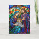 Desenho de vitral da sagrada família. Maria, José e o menino Jesus. No interior do cartão, em vermelho, está o versículo Mateus 1:23, "Eis que a virgem conceberá e dará à luz um Filho, e chamarão o seu nome Emanuel"