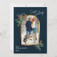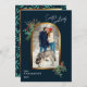 Este elegante cartão de Natal plano apresenta um quadro fotográfico de arco dourado, rodeado por uma simples folhagem e bagas de inverno e pela mensagem "Saudações da Estação". Torne-o verdadeiramente único com o seu nome de família e fotografia. Adicione uma mensagem pessoal no verso ou deixe o vazio excluindo o texto nesta seção Personalizar