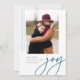 Um cartão de férias moderno e elegante, com uma fotografia vertical ou orientada por retratos, acentuado com faixas verticais finas. "Joy" aparece por baixo na tipografia casual escrita com letra de mão. Personalize com seu cartões de natal personalizado, seu nome de família e o ano. Uma escolha moderna e moderna para os cartões de Natal de 2021.