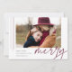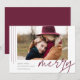Um cartão de férias moderno e elegante com uma fotografia horizontal ou orientada à paisagem, acentuado com faixas verticais finas. A "Feliz" aparece por baixo da tipografia casual escrita com letra de mão. Personalize com seu cartões de natal personalizado, seu nome de família e o ano. Uma escolha moderna e moderna minimalista para os cartões de Natal 2021.