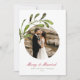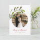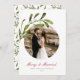 Um belo cartão de férias celebrando seu primeiro Natal como casal casado. O design apresentou sua foto favorita em uma abertura em círculo enfeitiçada com um ramo de água de névoa. Personalize o título da fonte do script cursivo vermelho e desconecte-se em verde escuro. No verso está um padrão de ramos de degustação de aquarelas.