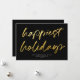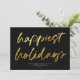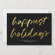 Este cartão festivo, mas moderno, apresenta um grande roteiro de caligrafia "feriados mais felizes" em folha de ouro falso sobre fundo preto. A parte de trás da carta também é preta. As cores de fundo e as cores de texto são personalizáveis. DESIGN DICA: você pode personalizar ainda mais este design, adicionando uma foto, logotipo e/ou texto adicional no verso.