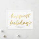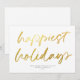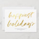Este cartão festivo, mas moderno, apresenta um grande roteiro de caligrafia "feriados mais felizes" em folha de ouro falso sobre um fundo branco. A parte traseira da placa também é branca. As cores de fundo e as cores de texto são personalizáveis. DESIGN DICA: você pode personalizar ainda mais este design, adicionando uma foto, logotipo e/ou texto adicional no verso.