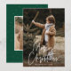 Cartões com fotos modernos de férias com sua foto vertical com "Feliz Natal", mostrados em um roteiro branco escrito à mão. Personalize o cartão fotográfico de Natal com seu nome de família e o ano. O cartão de feriado de fotos do solteiro reverte para exibir uma foto adicional e um fundo verde com sutis pontos brancos.