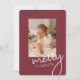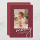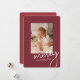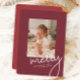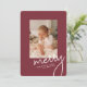 Um cartão de Natal minimalista moderno apresenta um roteiro de feliz branca na moda e cores vermelho-burgundy clássicas para um simples cartão de saudação de Natal elegante. Personalize a saudação clássica com sua foto personalizada da família!