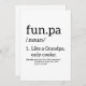Legal, clássico e cheio de charme – assim é o Funpa. Seja contando piadas ruins com timing de especialista, pilotando sua moto antiga ou furtando doces para os netos, ele faz tudo com estilo. Este design celebra a lenda que é Funpa – o avô que ainda tem o que é preciso (e muito mais).
