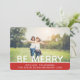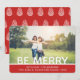 Celebre a temporada com este cartão de Natal moderno e elegante. O cartão apresenta uma foto completa com a palavra sobreposta Seja Alegre. Adicione as informações da sua família. A parte traseira do cartão tem um padrão de pinha desenhado à mão em um fundo vermelho festivo.