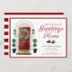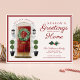 Diga a sua família e amigos que você tem um novo lar para as férias com nossas belas e elegantes épocas saudando o novo cartão de anúncio da casa. Nossa design apresenta nossa própria porta vermelha, pintada a água, com uma coroa festiva de Natal. Destacado com toques de ouro no slot da caixa de correio, alça da porta e prato da porta. Luzes escuras modernas de parede exterior e uma porta de boas-vindas de uma toca completa esta nova e encantadora design de Natal. Personalize com seu novo número de endereço residencial na porta frontal no meio da coroa de Natal e adicione seu nome e novas informações de endereço/contato. O verso apresenta um padrão moderno de riscas vermelhas e brancas. Todas as ilustrações são obras de arte originais pintadas manualmente pela Moodthology.