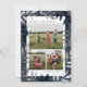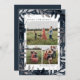 Um cartão fotográfico elegante, com galhos de pinheiro desenhados à mão, numa folha de cor prata e azul marinho festiva desenhada por Stacey Meacham. A parte de trás oferece outra oportunidade de enviar mensagens de feriado para amigos e familiares.