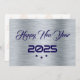 Greeting wish card Happy New Year written in English in purple font with 3 stars on a silver background - editable text and background