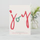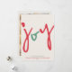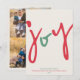 Desses cartões de Natal minimalistas de 5" x 7" apresentam a saudação, "alegria", em uma fonte divertida vermelha e verde grande com a saudação adicional editável, "Desejando paz, amor e alegria nesta época de festas". Basta adicionar o(s) nome(s) da sua família e o ano. Adicione três das suas fotos favoritas no verso do cartão.