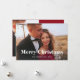 Este simples e na moda cartão com fotos de Natal diz "Feliz Natal" em tipografia ousada, branca e elegante moderna com a sua foto pessoal favorita na frente do cartão. Sua mensagem de feriado pessoal pode ir atrás, com um design mínimo vermelho e branco.