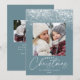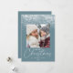Cartão de férias único e moderno, com flores brancas a cair, no topo do design, com um fundo azul fosco festivo. Sua foto quadrada é exibida no meio da design com o cartões de natal, "Feliz Natal", em um roteiro de caligrafia branca, mostrado abaixo. Personalize a frente do cartão de feriado floco de neve adicionando seu nome e o ano. A placa se reverte para exibir uma foto adicional com sua mensagem pessoal em letras brancas modernas.