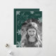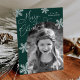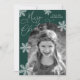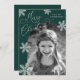 Elegante cartão com fotos de feriado com sua foto vertical moldada por um arco verde e flocos de neve brancos. "Feliz Natal" é exibido em um roteiro de caligrafia branca. Personalize a frente do cartão de Natal do floco de neve adicionando seu nome. O cartão se reverte para exibir uma foto adicional, o ano e sua mensagem personalizada em letras brancas em um fundo verde de corrida.