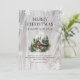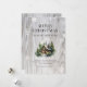 Watercolor Cartão de Natal Merry com uma cabana de madeira no bosque contra um fundo de madeira rústica adornado com flocos de neve. Personalize facilmente este cartão de feriado com o seu nome e texto de família.